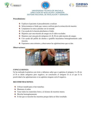 El documento describe una práctica de laboratorio para determinar el grupo sanguíneo de una persona. Se explica el procedimiento, que incluye la extracción de sangre, mezclarla con diferentes antígenos (A, B, D), y observar las aglutinaciones para identificar cuál es el grupo sanguíneo. La conclusión es que el antígeno D es el que determina si las aglutinaciones son positivas o negativas, y que si no hay aglutinación con ningún antígeno, el grupo es 0 negativo.