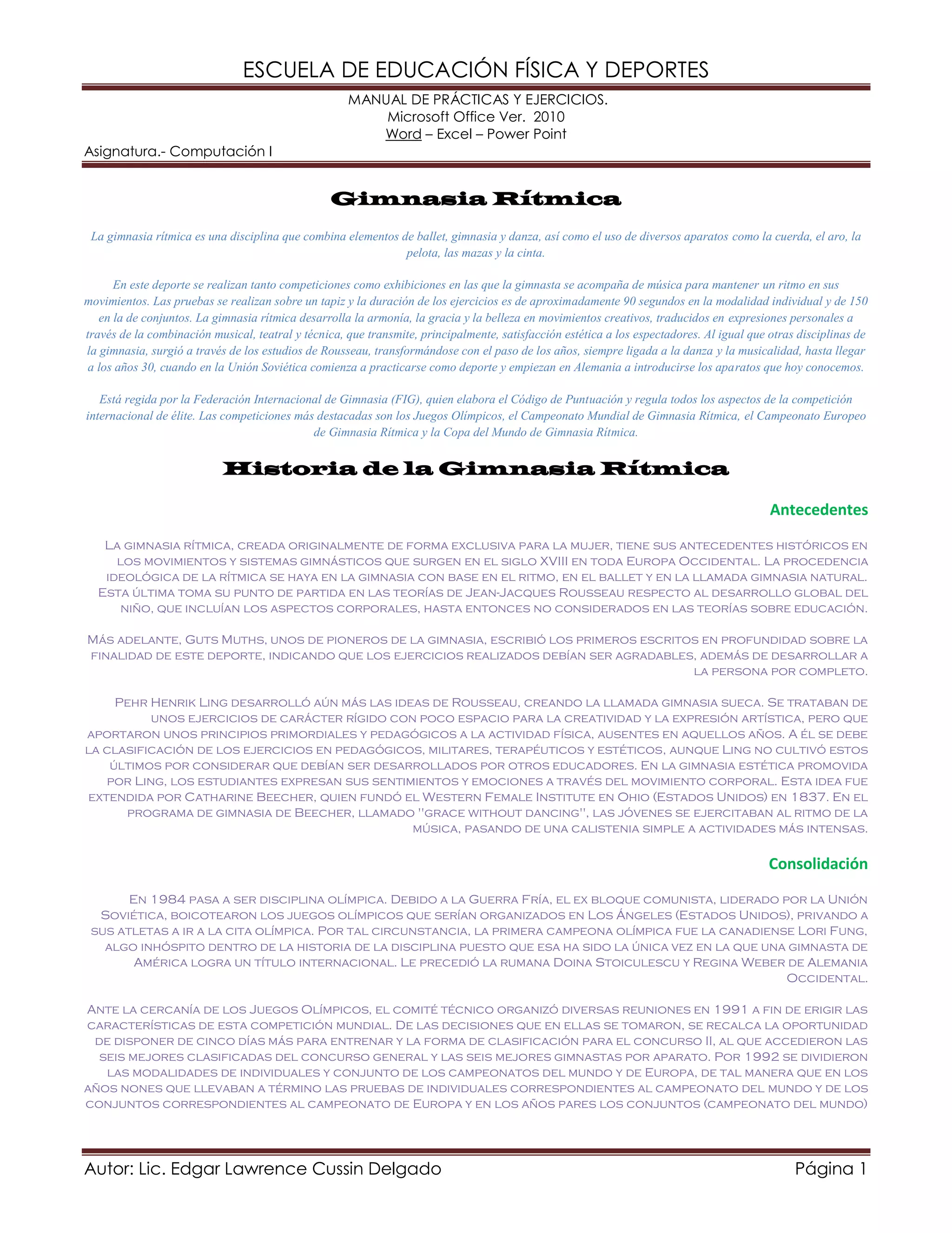 La gimnasia rítmica es una disciplina que combina elementos de ballet, gimnasia y danza, así como el uso de aparatos como la cuerda, el aro, la pelota, las mazas y la cinta. Tiene sus orígenes en los estudios de Rousseau sobre educación física en el siglo XVIII y se desarrolló en la Unión Soviética en los años 30 como deporte olímpico. Actualmente es regulada por la Federación Internacional de Gimnasia y sus competiciones más importantes son los Juegos Olímpicos, el