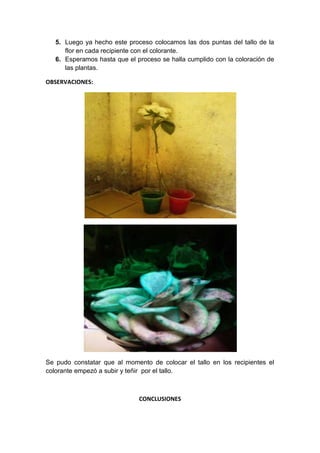 Este documento describe un experimento para cambiar el color de una flor mediante la pigmentación. Explica los materiales necesarios, el procedimiento de cortar la flor y colocar su tallo en agua con colorante, y observa que el colorante subió por el tallo hasta teñir la flor a través de los vasos conductores de la planta. Concluye que el colorante alcanzó la flor gracias al sistema de transporte de la savia en la planta.