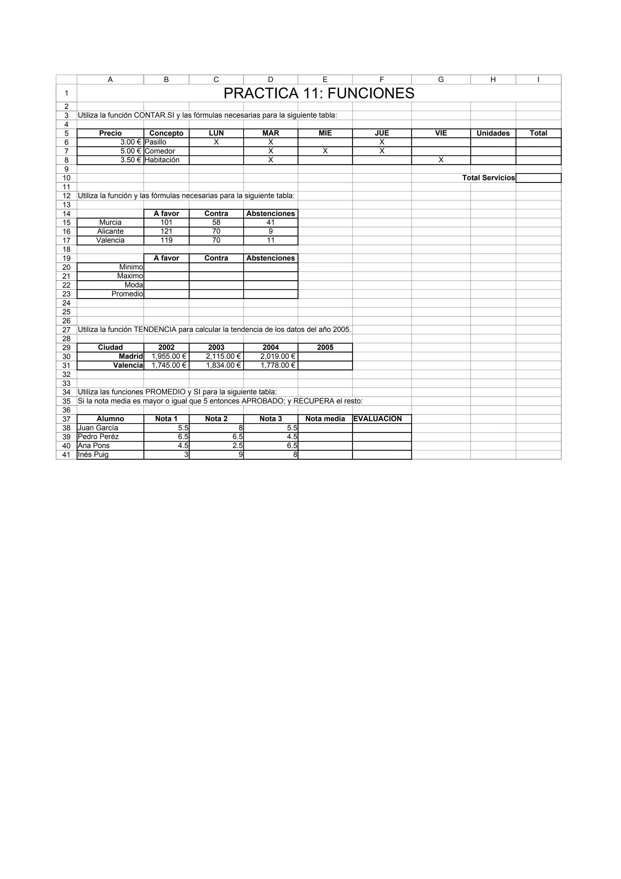 Este documento presenta varios ejercicios para practicar el uso de funciones en Excel. El primer ejercicio utiliza la función CONTAR.SI para contar las unidades y calcular el total de diferentes conceptos en una tabla. El segundo ejercicio utiliza funciones para analizar datos electorales como el mínimo, máximo, moda y promedio. El tercer ejercicio usa la función TENDENCIA para analizar datos de varios años. El último ejercicio usa las funciones PROMEDIO y SI para calcular la nota media de los alumnos y determinar si aprueban o deben