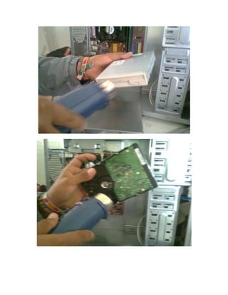 Este documento describe una práctica de mantenimiento de computadoras realizada por tres estudiantes y su maestro. La práctica consistió en desarmar una computadora, soplar sus componentes internos y externos con aire para limpiar el polvo, y luego volver a armarla. Los estudiantes aprendieron cómo desarmar y armar una computadora para poder repararlas ellos mismos en el futuro.