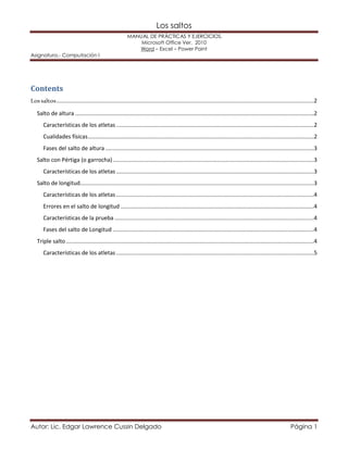 El documento describe las diferentes pruebas de salto en atletismo, incluyendo salto de altura, salto con pértiga, salto de longitud y triple salto. Detalla las características de los atletas de cada prueba, las fases de los saltos, y los errores comunes. Explica que tradicionalmente solo los hombres practicaban el triple salto y salto con pértiga, pero desde 1990 también son practicadas por mujeres.