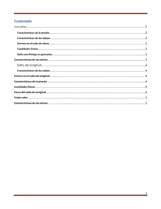 El documento describe diferentes pruebas de salto en atletismo. Explica las características de la prueba, los atletas y las fases de cada salto, incluyendo salto de altura, salto con pértiga, salto de longitud y triple salto. Proporciona detalles sobre la técnica, cualidades físicas requeridas y errores comunes en cada disciplina.
