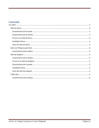 El documento describe diferentes tipos de saltos atléticos. Habla sobre el salto de altura, salto con pértiga, salto de longitud y triple salto. Describe las características de cada prueba como la técnica, cualidades físicas requeridas y fases de cada salto. También discute las características de los atletas ideales para cada disciplina y errores comunes.
