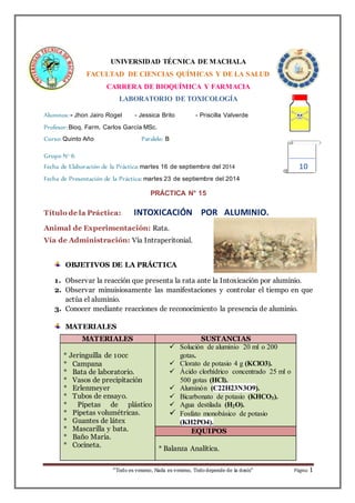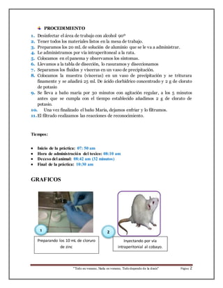 El documento describe un experimento en el que se intoxicó a una rata con aluminio por vía intraperitoneal. La rata mostró mareos, vómitos y convulsiones y murió a los 32 minutos. Las pruebas de reconocimiento en los órganos de la rata confirmaron la presencia de aluminio. El aluminio es una sustancia altamente tóxica que actuó rápidamente causando la muerte del animal.