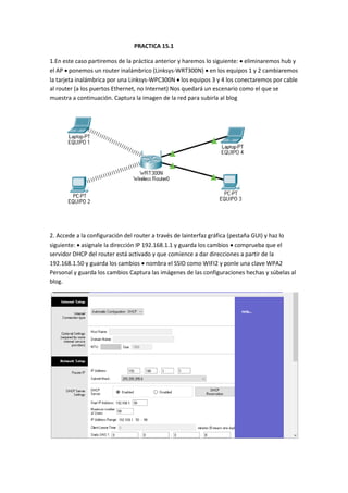 Este documento describe los pasos para configurar una red inalámbrica doméstica. Se elimina el hub y el punto de acceso y se sustituye por un router inalámbrico Linksys-WRT300N. Se cambian las tarjetas de red inalámbricas de dos equipos y se conectan otros dos por cable al router. A continuación, se configura la dirección IP del router a 192.168.1.1, se activa el servidor DHCP y se establece el SSID "WIFI2" con clave WPA2. Finalmente, se comprueba la cone