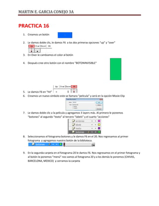 Este documento describe los pasos para crear una animación interactiva en Flash que incluye botones y etiquetas cambiantes. Se crean botones y capas, se agregan acciones para cambiar los estados de los botones y etiquetas, y se prueba la animación.