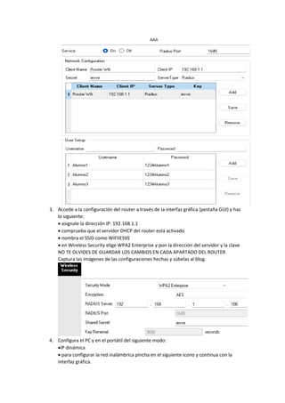 Este documento describe los pasos para configurar una red inalámbrica con autenticación mediante servidor RADIUS. Se instala un router inalámbrico y tarjetas WiFi en un PC y portátil. El servidor se conecta por cable al router y se configura con una IP fija y el servicio RADIUS habilitado, añadiendo usuarios. Luego se configura el router con la misma subred y el servidor RADIUS como autenticación. Finalmente, se configuran la conexión inalámbrica en el PC y portátil y se comprueba la cone
