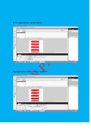 El documento describe cómo crear botones animados en Adobe Flash. Se crea un rectángulo, se copia varias veces para crear múltiples cuadros, y se agrega texto a cada cuadro. Luego, los cuadros se convierten en botones y se les agrega una animación para que cuando se presionen se muevan.