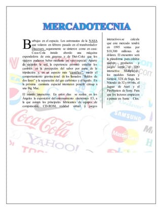 El documento habla sobre dos temas principales. Primero, describe cómo Coca-Cola instaló una máquina expendora de Coca-Cola y Diet Coke a bordo del transbordador Discovery de la NASA para estudiar el comportamiento de los líquidos en el espacio y la percepción del sabor de los astronautas. Segundo, describe la exposición anual E3 en Los Ángeles sobre equipos de computación, juegos interactivos y realidad virtual, con una estimación de que este mercado tendrá ventas de $10,300 millones en 1995 y mostrará nuevos productos como