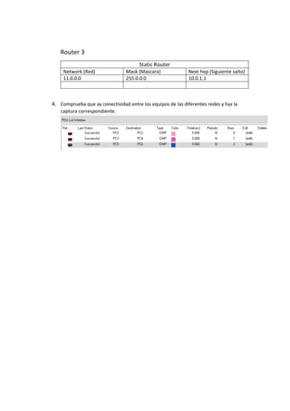 El documento instruye sobre cómo configurar una red en Packet Tracer con 8 equipos PC distribuidos en 4 redes diferentes (10.0.0.0, 11.0.0.0, 12.0.0.0 y 13.0.0.0) y 3 routers para proporcionar conectividad entre todos los equipos. Se especifican las direcciones IP, máscaras de subred y puertas de enlace para cada equipo PC y la configuración de encaminamiento estático requerida en cada router para lograr la conectividad entre redes. Finalmente, se pide verificar la