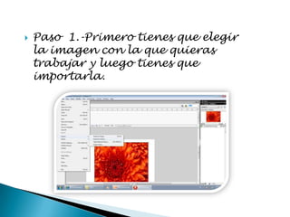 Este documento proporciona 10 pasos para generar una animación con elementos multimedia utilizando una imagen. Los pasos incluyen importar una imagen, convertirla en un botón, convertirla en símbolos gráficos con diferentes propiedades de color y brillo para tres cuadros clave, y reproducir la animación al pasar el puntero y hacer clic.