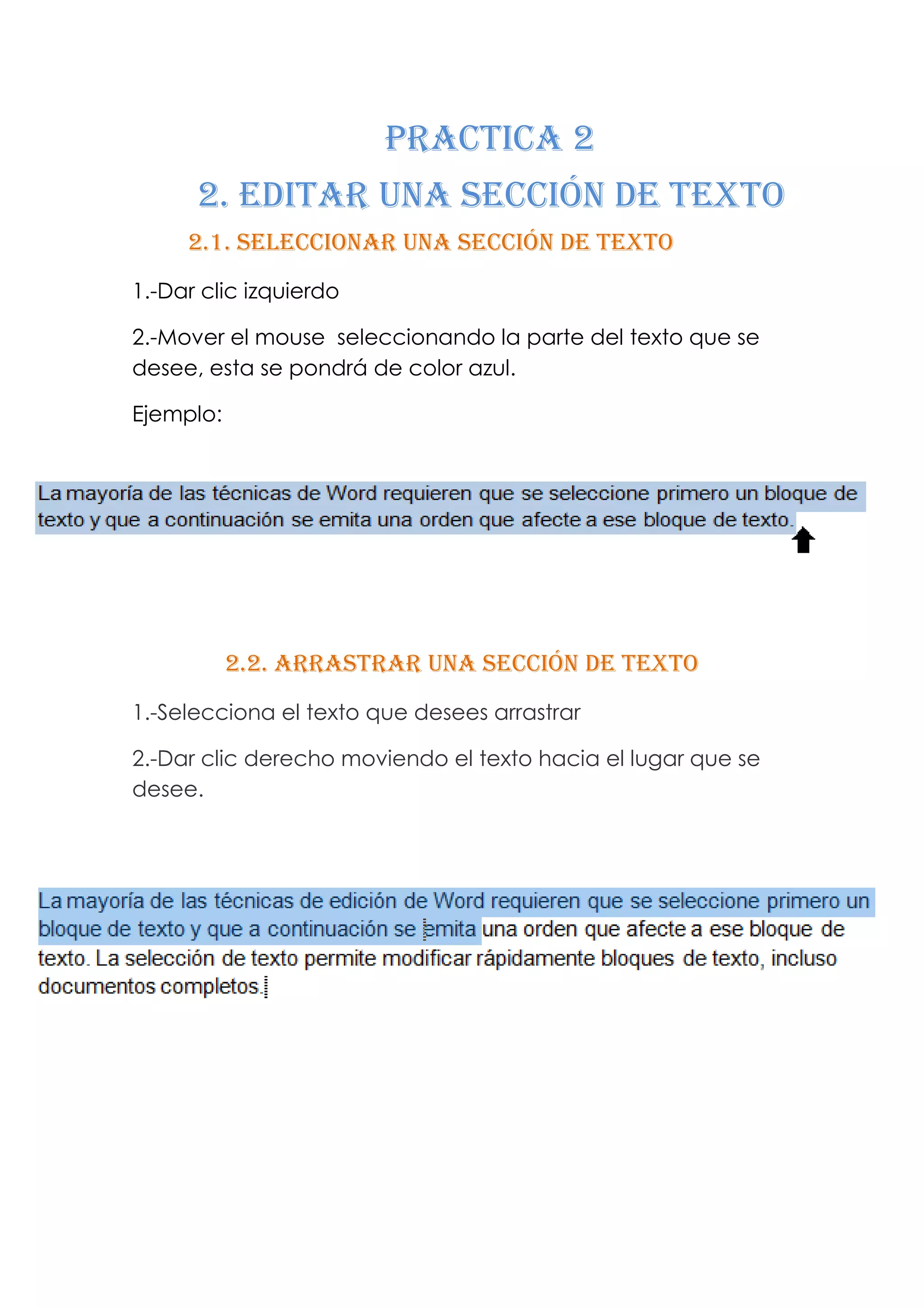 Este documento proporciona instrucciones sobre cómo editar secciones de texto, incluyendo cómo seleccionar, arrastrar, copiar, pegar y cortar fragmentos de texto. Explica que para seleccionar texto se debe hacer clic izquierdo y arrastrar el mouse sobre el texto, y para mover, copiar o cortar texto se debe hacer clic derecho y seleccionar la opción correspondiente desde el menú.