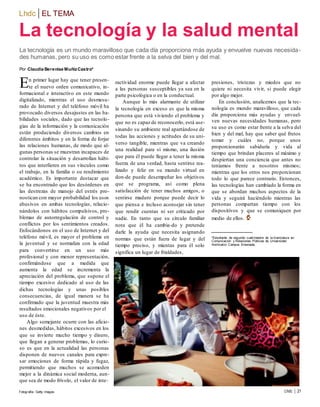 El documento discute los efectos positivos y negativos del uso excesivo de la tecnología en la salud mental. Señala que aunque la tecnología proporciona muchas ayudas y satisface necesidades humanas, su uso desmedido puede causar problemas como la pérdida de habilidades sociales y afectar las relaciones. Específicamente, el uso excesivo de Internet y los teléfonos móviles se relaciona con trastornos en el manejo del estrés y comportamientos compulsivos en los jóvenes. Además