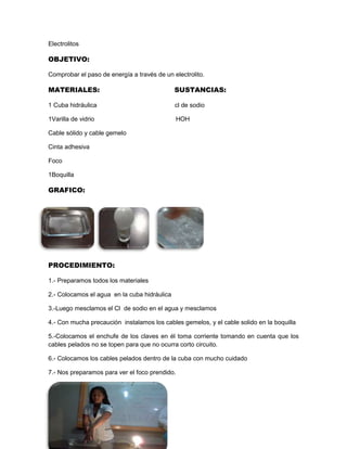 El documento describe un experimento sobre electrolitos. Los estudiantes colocaron agua y cloruro de sodio en una cuba hidráulica y conectaron cables para producir energía eléctrica a través de la electrolisis. Observan que al meter los cables en la mezcla se enciende un foco, comprobando que los electrolitos pueden producir energía. El documento también incluye preguntas sobre conceptos como ánodos, cátodos, cationes y aniones.