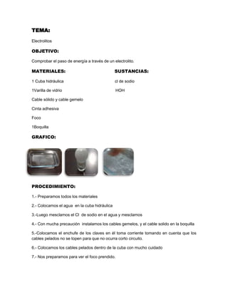 Este documento resume una práctica de laboratorio sobre electrolitos. Los estudiantes colocaron agua y cloruro de sodio en una cuba hidráulica y cables conectados a un foco para demostrar que los electrolitos pueden conducir la corriente eléctrica y producir energía. El experimento tuvo éxito al encenderse el foco, comprobando que los electrolitos pueden producir energía a través de la electrolisis.
