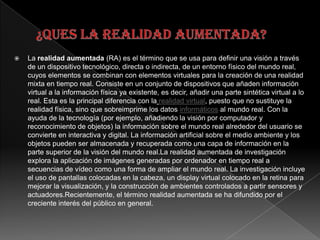 La realidad aumentada (RA) permite superponer información virtual sobre el mundo real de forma interactiva en tiempo real. La RA se diferencia de la realidad virtual en que no sustituye el mundo físico, sino que añade una capa de datos virtuales. Un uso común de la RA es la superposición de texto e imágenes sobre lo que se ve a través de una cámara para proporcionar información contextual.