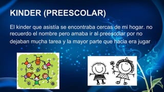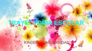 El documento describe la trayectoria escolar de alguien desde el kinder hasta la universidad. Asistió a un preescolar cercano a su hogar que no dejaba mucha tarea y donde la mayor parte del tiempo jugaba. En la primaria estudió en una escuela llamada Guadalupe Victoria donde conocía a la mayoría de sus compañeros y profesores. En la secundaria asistió a la escuela Lazaro Cardenas del Rio donde perteneció al equipo de voleibol y la banda de guerra. En la preparatoria tuvo más responsabilidades pero