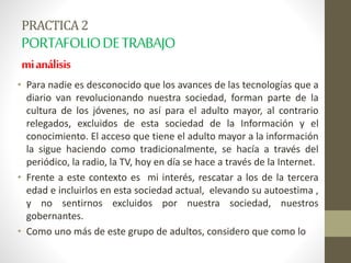 Este documento presenta un proyecto para enseñarles a adultos mayores habilidades digitales básicas y el uso de la computadora e Internet. El proyecto tiene dos fases: la primera enseña el uso de hardware y software básicos, y la segunda enseña la búsqueda y gestión de información en Internet a través de la creación colaborativa de un blog. El objetivo general es integrar a los adultos mayores en la sociedad digital y elevar su autoestima.