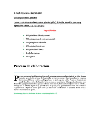 Este documento proporciona una receta para un platillo que combina carne y fruta. La receta incluye bistec, pechuga de pollo, piña, jamón y queso Oaxaca. Los ingredientes se cortan y luego se cocinan juntos con cebolla y queso hasta que la carne esté cocida y el queso fundido, durante aproximadamente 40 minutos. El resultado es un platillo rápido, sencillo y de sabor agradable que combina la carne y la fruta.