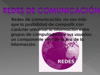 Este documento describe los tipos de redes de comunicación según su extensión geográfica. Explica que una red puede empezar como un segmento de red pequeño y crecer hasta convertirse en una red de área local (LAN), de campus, metropolitana (MAN), de área extensa (WAN) o global a medida que la organización se expande geográficamente. Define cada tipo de red según su alcance, desde segmentos y LAN limitadas a un edificio, hasta WAN y redes globales que se extienden entre ciudades, países y