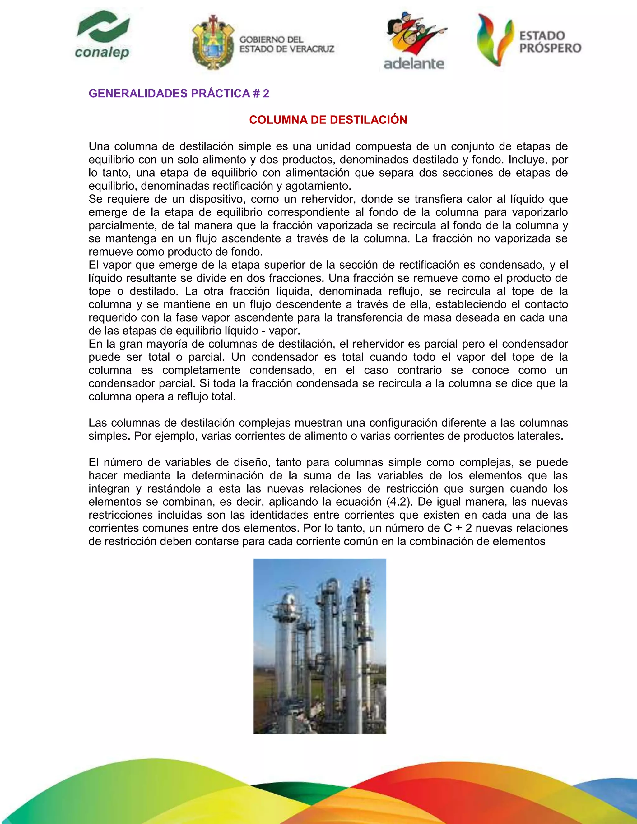 Este documento describe los componentes principales de una columna de destilación simple y un generador de vapor. Explica que una columna de destilación consiste en etapas de equilibrio con un alimento y dos productos, y que un generador de vapor calienta un líquido para generar vapor a presión constante. También cubre los tipos básicos de calderas y sus usos comunes en la industria para generar vapor.