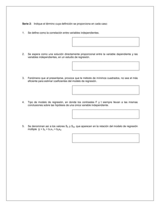Este documento presenta una práctica de regresión lineal múltiple que incluye cuatro secciones. La primera sección define los términos clave de regresión, correlación, variables independientes y dependientes. La segunda sección pide identificar definiciones. La tercera sección analiza datos de ventas, calidad y precio de 10 tiendas. La cuarta sección pide resolver problemas de un libro de texto.