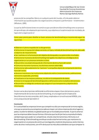 El documento describe el proceso de benchmarking como una herramienta para mejorar la competitividad de las empresas. Define benchmarking como un proceso sistemático y continuo de evaluar y comparar los productos, servicios y procesos de las mejores empresas para identificar prácticas exitosas y realizar mejoras. Explica que involucra la comparación interna y externa para optimizar resultados. También describe las etapas del proceso de benchmarking y concluye que debe ser adoptado de forma continua para mejorar la calidad y productividad de una empresa a largo plaz