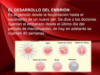 El documento describe las etapas del desarrollo embrionario desde la fecundación hasta el nacimiento, incluyendo la segmentación, la blastulación, la gastrulación y la organogénesis. Luego detalla las 40 semanas del embarazo semana a semana, describiendo el crecimiento y desarrollo del feto y los cambios que experimenta la madre. El documento proporciona una descripción completa del desarrollo prenatal desde la concepción hasta el nacimiento.