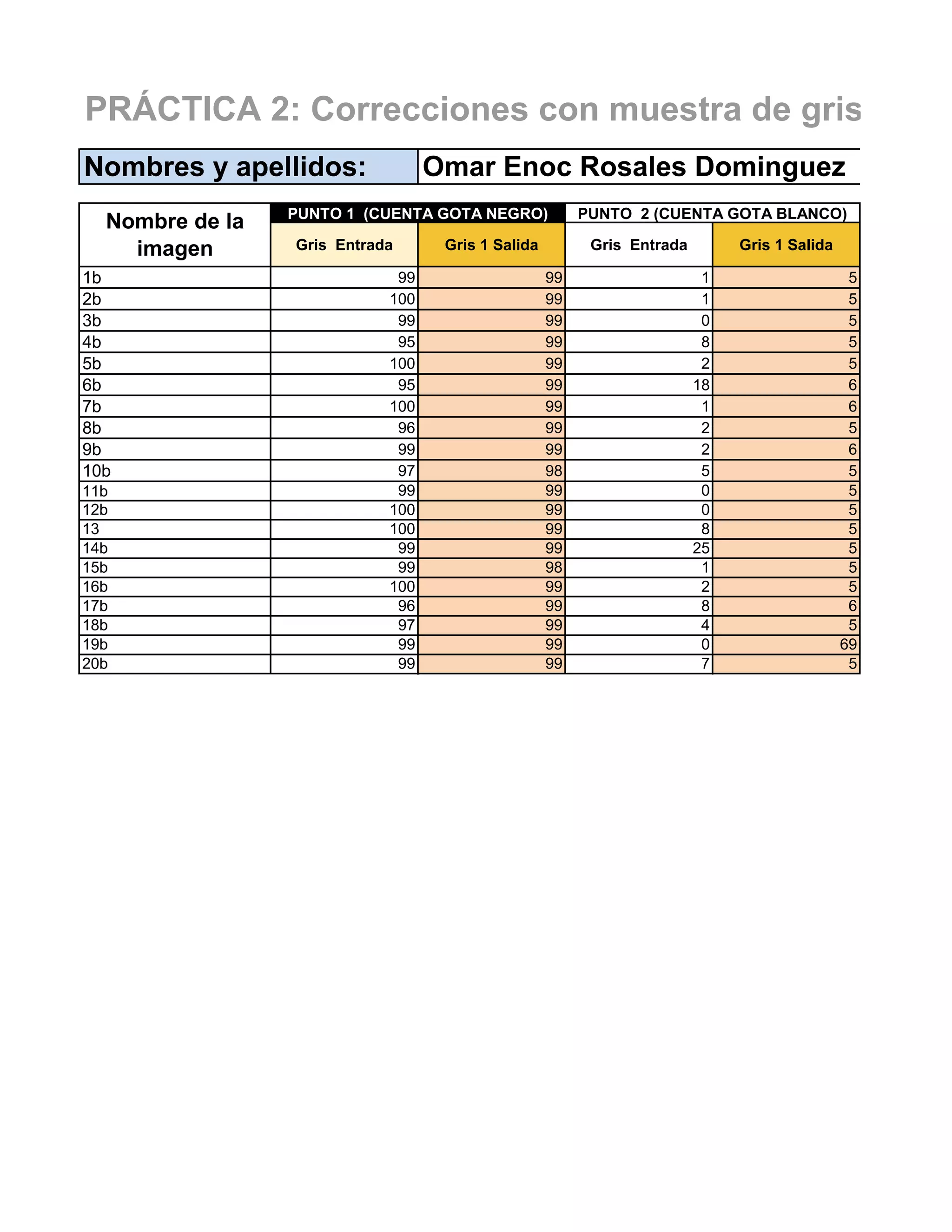 Este documento presenta los resultados de un ejercicio de corrección de imágenes en escala de grises. Se muestran 20 filas con el nombre de la imagen, el punto de cuenta de gotas en negro, el punto de cuenta de gotas en blanco y la sumatoria de tinta negra. Los datos parecen haber sido recolectados como parte de una práctica para corregir imágenes en escala de grises.