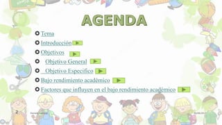 El documento resume los factores que influyen en el bajo rendimiento académico de los estudiantes. Algunos de estos factores incluyen dificultades en las asignaturas, una gran cantidad de exámenes, y factores psicológicos. El documento también establece objetivos generales y específicos para analizar este tema.