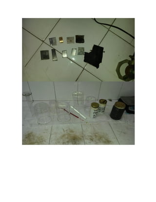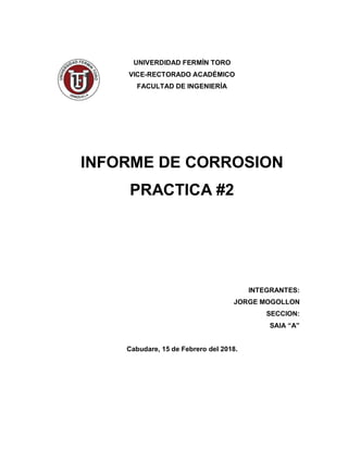 Este informe presenta los resultados de una práctica de laboratorio sobre la corrosión de diferentes metales. Se sumergieron probetas de acero galvanizado, acero inoxidable, cobre, acero bajo carbono y otras en soluciones de sulfato de cobre, ácido clorhídrico y nitrato de plata. Se observó que el acero galvanizado y el cobre se corroían más que los otros metales debido a sus potenciales de oxidación, mientras que el acero inoxidable no sufría corrosión gracias a su capa protector