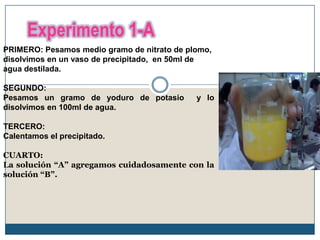El documento describe una serie de experimentos químicos. Experimento 1-A involucra la mezcla de nitrato de plomo y yoduro de potasio, observando un cambio de color. Experimento 1-B observa cambios de color en clavos y alambre de cobre. Experimento 1-C agrega diferentes ácidos a una solución de bicarbonato de sodio. Experimento 1-D observa la oxidación de frutas. Experimento 1-E calienta cinta de magnesio. Experimento 1-F agrega glicerina a permanganato de