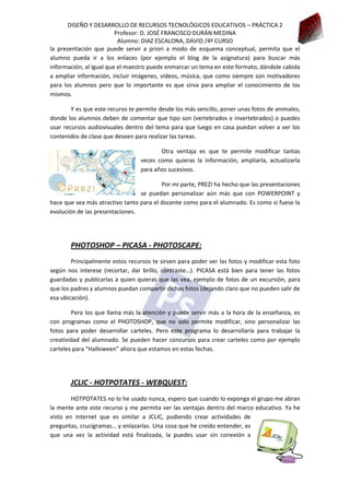 Este documento resume las ventajas y desventajas de varios recursos tecnológicos educativos como pizarras digitales interactivas, PowerPoint, Photoshop y blogs. Algunas ventajas clave son que motivan a los estudiantes y rompen con la inercia de las clases tradicionales. Sin embargo, estos recursos requieren tiempo para su manejo y no todos los estudiantes tienen acceso a la tecnología necesaria para usarlos.