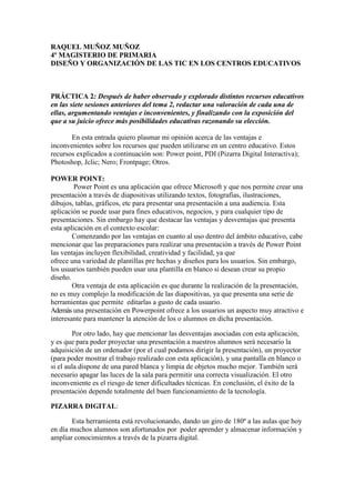 El documento resume las ventajas e inconvenientes de varios recursos educativos basados en tecnología, incluyendo PowerPoint, pizarras digitales interactivas, Photoshop, Jclic y Nero. Destaca que estos recursos pueden aumentar la motivación de los estudiantes y la efectividad de la enseñanza, pero también requieren acceso a la tecnología y capacitación docente.