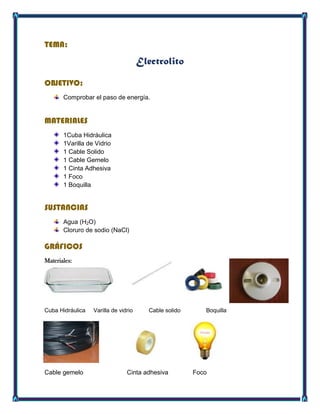 Este documento describe un experimento sobre electrolitos realizado por estudiantes de enfermería. El objetivo era comprobar el paso de energía a través de una solución acuosa de cloruro de sodio. Al conectar los cables a la solución, el foco se encendió, mostrando que los electrolitos conducen la energía. Los estudiantes concluyeron que los electrolitos son buenos conductores de energía.