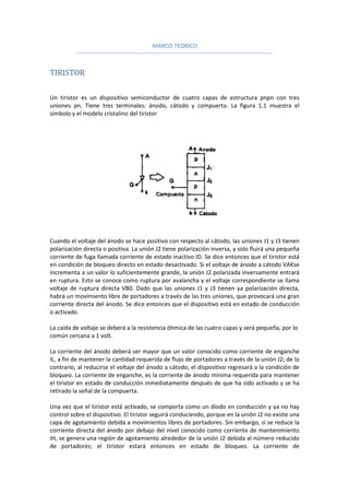 Este documento describe el funcionamiento del tiristor, un dispositivo semiconductor de cuatro capas. Explica que el tiristor puede estar en estado de bloqueo o conducción dependiendo de la polarización de las uniones pn y la corriente aplicada. También define conceptos clave como la corriente de compuerta, corriente de enganche y corriente de mantenimiento. Finalmente, presenta tres ejercicios para calcular estas corrientes basados en valores medidos de un tiristor real.