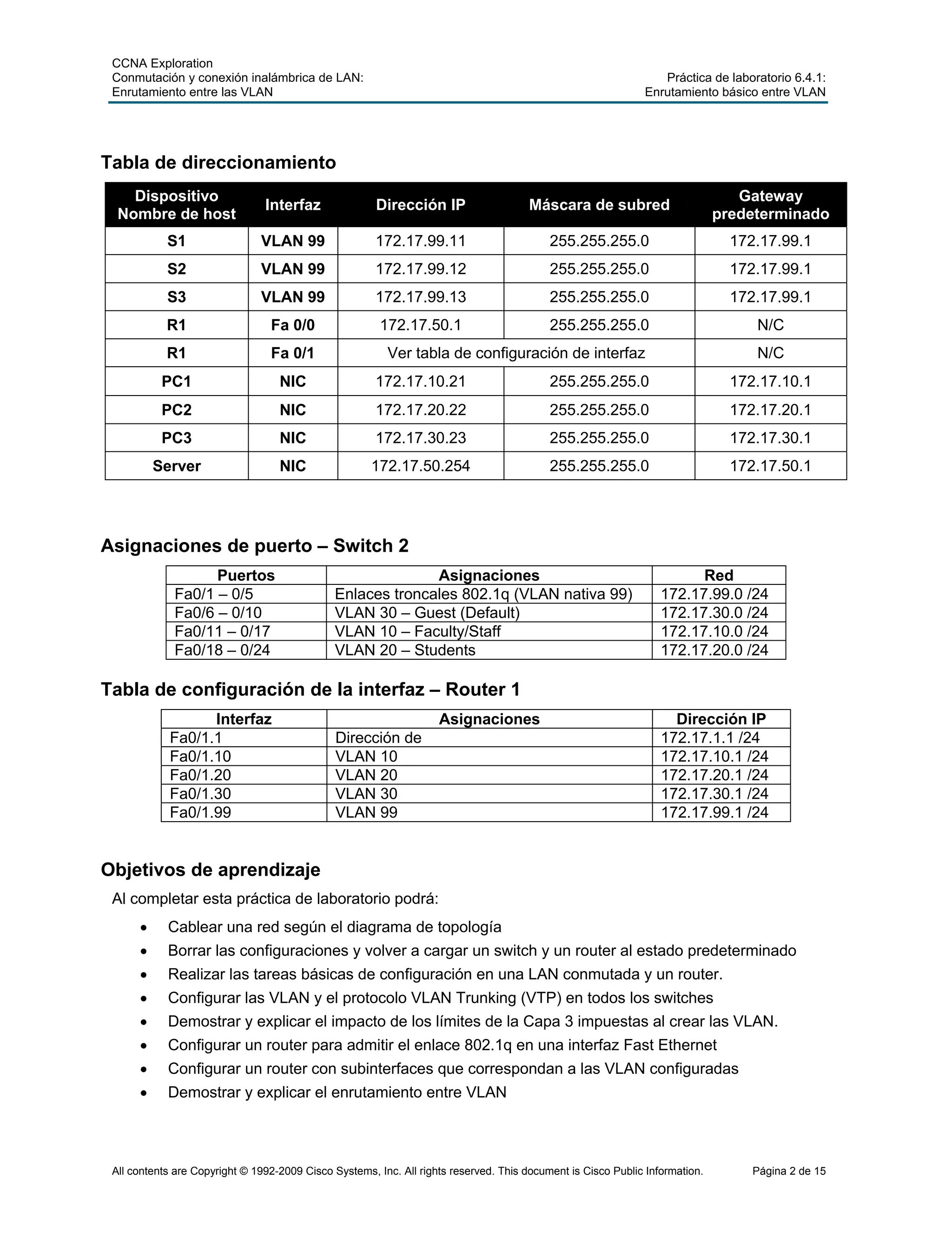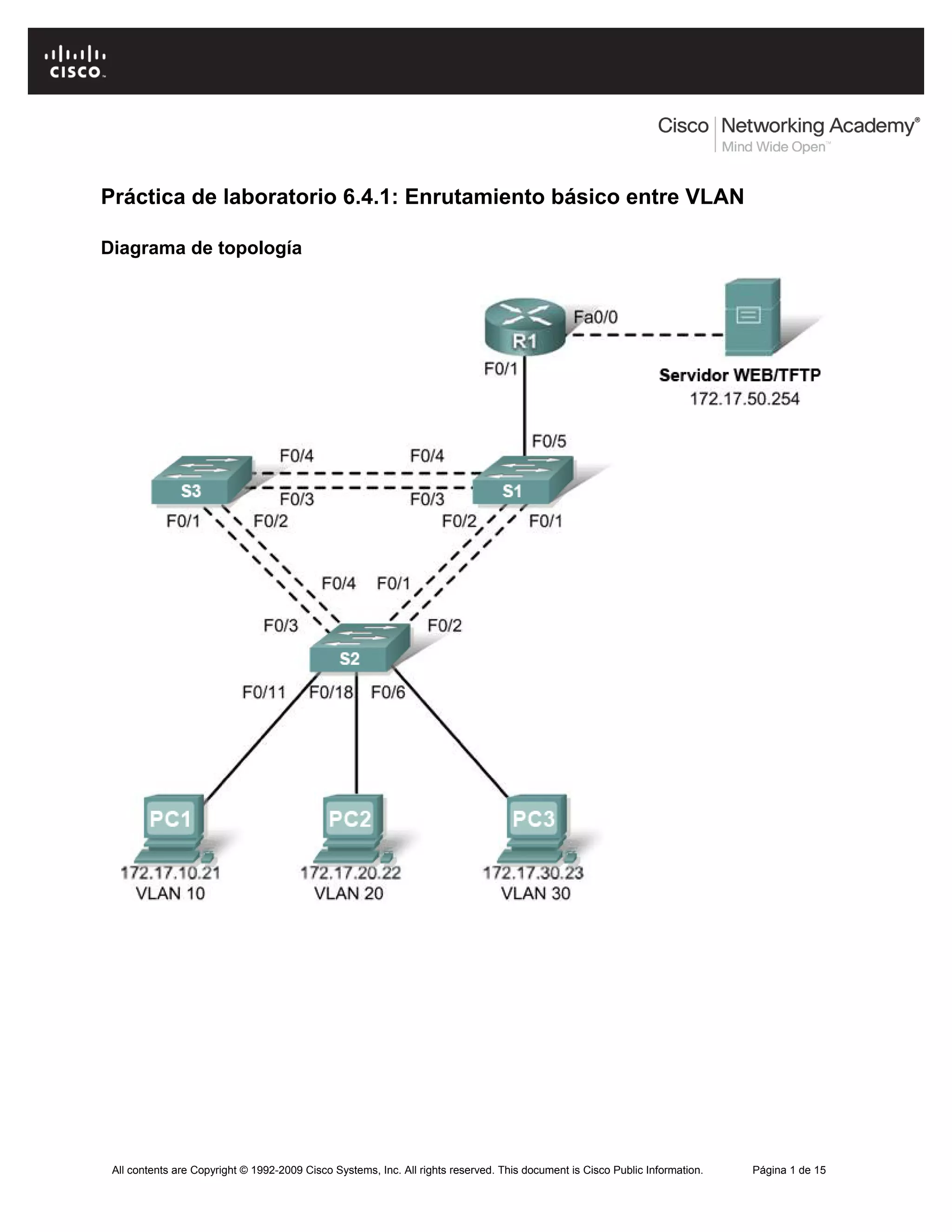 Este documento describe los pasos para configurar el enrutamiento básico entre VLAN en una red de laboratorio. Incluye una tabla de direccionamiento, diagrama de topología y pasos para configurar switches, router y hosts. Los pasos incluyen configurar VLAN, VTP, subinterfaces de router y enlaces troncales para permitir el tráfico entre las VLAN a través del router.