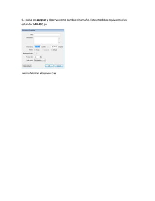 El documento proporciona instrucciones para configurar las propiedades de un documento en Macromedia Flash para que tenga un tamaño estándar de 640x480 píxeles. Las instrucciones incluyen abrir Macromedia Flash, seleccionar Propiedades de Documento, establecer la unidad de medida en centímetros y establecer las dimensiones del documento en 22.46 cm de ancho y 16.84 cm de alto.