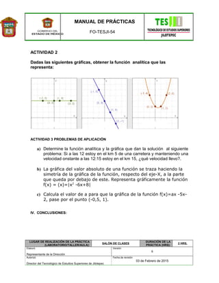 Este manual describe una práctica de 2 horas sobre funciones realizadas en un salón de clases. La práctica incluye 3 actividades para comprender conceptos de funciones como su definición, tipos y propiedades, así como graficar funciones dadas tablas de valores o gráficas y resolver problemas de aplicación usando funciones.
