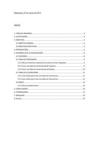 Este documento describe cómo crear tablas de contenido, tablas de ilustraciones e índices en Microsoft Word. Explica cómo insertar secciones para separar diferentes partes de un documento, y cómo crear y personalizar tablas de contenido automáticas utilizando estilos de títulos. También cubre cómo crear una tabla de ilustraciones mediante el uso de títulos y estilos, y cómo generar un índice para facilitar la navegación dentro de un documento largo.
