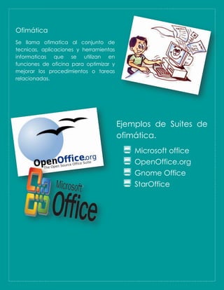 La ofimática se refiere al conjunto de técnicas y herramientas informáticas que se usan en funciones de oficina para optimizar tareas relacionadas. Algunos ejemplos de suites de ofimática son Microsoft Office, OpenOffice.org, Gnome Office y StarOffice. La bibliografía incluye libros sobre pensamiento sistemático, historia de la computación y fronteras de la computación.