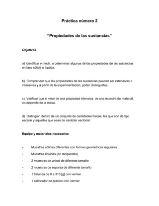 Este documento resume una práctica de laboratorio realizada por estudiantes de ingeniería sobre las propiedades de sustancias. La práctica midió propiedades como masa, volumen y densidad de muestras sólidas y líquidas. Los estudiantes identificaron propiedades extensivas e intensivas y determinaron si eran escalares o vectoriales. Al final, concluyeron que la práctica les ayudó a comprender mejor los conceptos teóricos sobre las propiedades de las sustancias.