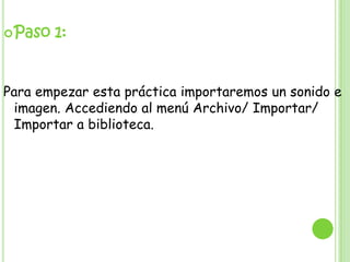 Este documento describe los pasos para importar un sonido e imagen a Adobe Premiere Pro y combinarlos en una secuencia. Primero se importan los archivos multimedia, luego se añade una capa para el sonido y otra para la imagen, colocándolos en diferentes fotogramas. Finalmente, se reproduce la secuencia con ambos elementos combinados.