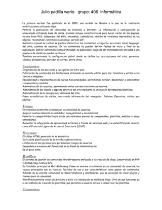 Este documento proporciona información sobre varios sistemas de administración de contenidos populares como Drupal, Joomla, WordPress y Xoops. Explica sus características principales, ventajas y desventajas. También describe brevemente el sistema CMS Made Simple.