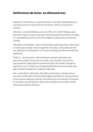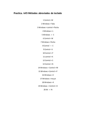 Este documento lista 20 métodos abreviados de teclado utilizando las teclas Control, Windows, Tabulador, F, y Alt junto con otras teclas para realizar acciones como minimizar ventanas, copiar y pegar texto, imprimir páginas y cambiar entre aplicaciones. Además, define brevemente qué son las teclas Control, Windows, Tabulador, F y Alt y sus usos comunes.