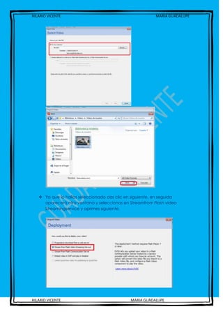 El documento proporciona instrucciones en 3 pasos para importar un video a Macromedia: 1) Abrir un nuevo documento en Macromedia y seleccionar importar video, 2) Seleccionar el video desde el equipo y cambiar la opción a "Stream from Flash Video Streaming Service", 3) Guardar el trabajo y reproducir el video oprimiendo F6.