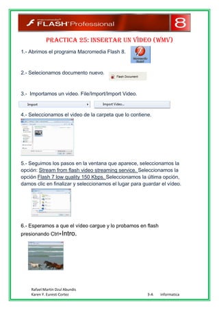 Este documento proporciona instrucciones en 5 pasos para insertar un video WMV en Macromedia Flash 8, incluyendo abrir el programa, importar el video desde una carpeta, seguir los pasos en la ventana de importación para seleccionar opciones como calidad baja de 150 Kbps, y probar el video presionando Ctrl + Intro.