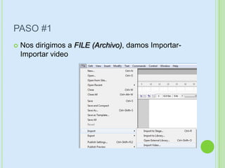 El documento proporciona 9 pasos para importar un video a PowerPoint y agregar texto sobre el video. Estos pasos incluyen seleccionar el archivo de video, elegir la calidad de streaming, completar la importación y agregar una capa de texto sobre el video en el escenario.