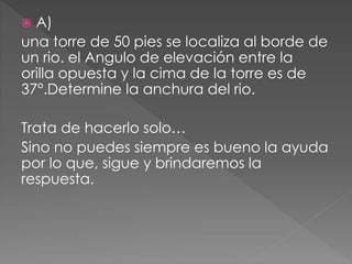 El documento presenta tres problemas de geometría que involucran ángulos y distancias. El primer problema determina el ancho de un río usando el ángulo de elevación a una torre y su altura. El segundo calcula la altura de un edificio usando ángulos de depresión y elevación. El tercero encuentra el ángulo de una carretera usando su longitud e incremento de altura.